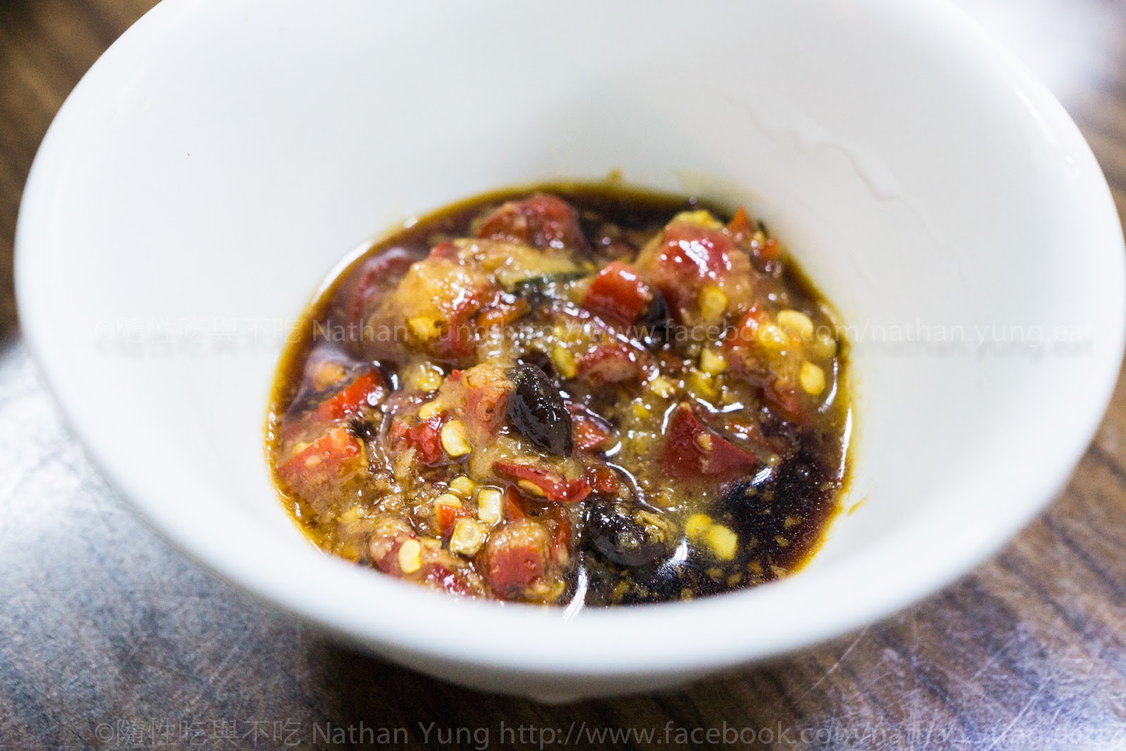 裡面有辣椒、豆豉等,不過還有一味大概是「鹹魚」,不知道我有沒有弄錯,各位有去吃的話,可以嘗試在這碗裡面撈撈看。
