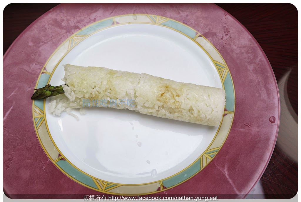 而有的食材比較重,如米飯,就不太會浮起來,除非裝的少,下圖就是浮的不是很高的米飯,而且我插蘆筍來實驗,因為不夠緊實,所以歪歪的。