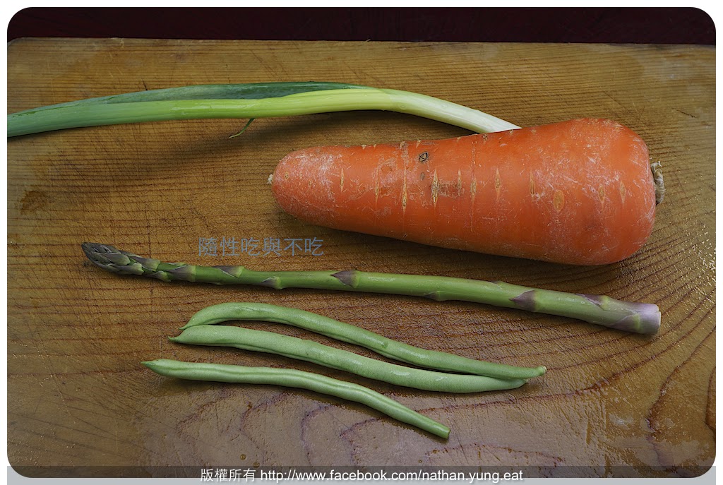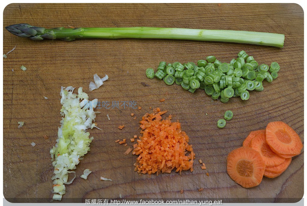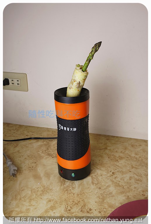 為什麼插蘆筍?實驗中要知道正中心的加熱速度,我確定一次燈號變換就可以讓中心的蘆筍熟透。確認後,後來的我都沒加蘆筍了。